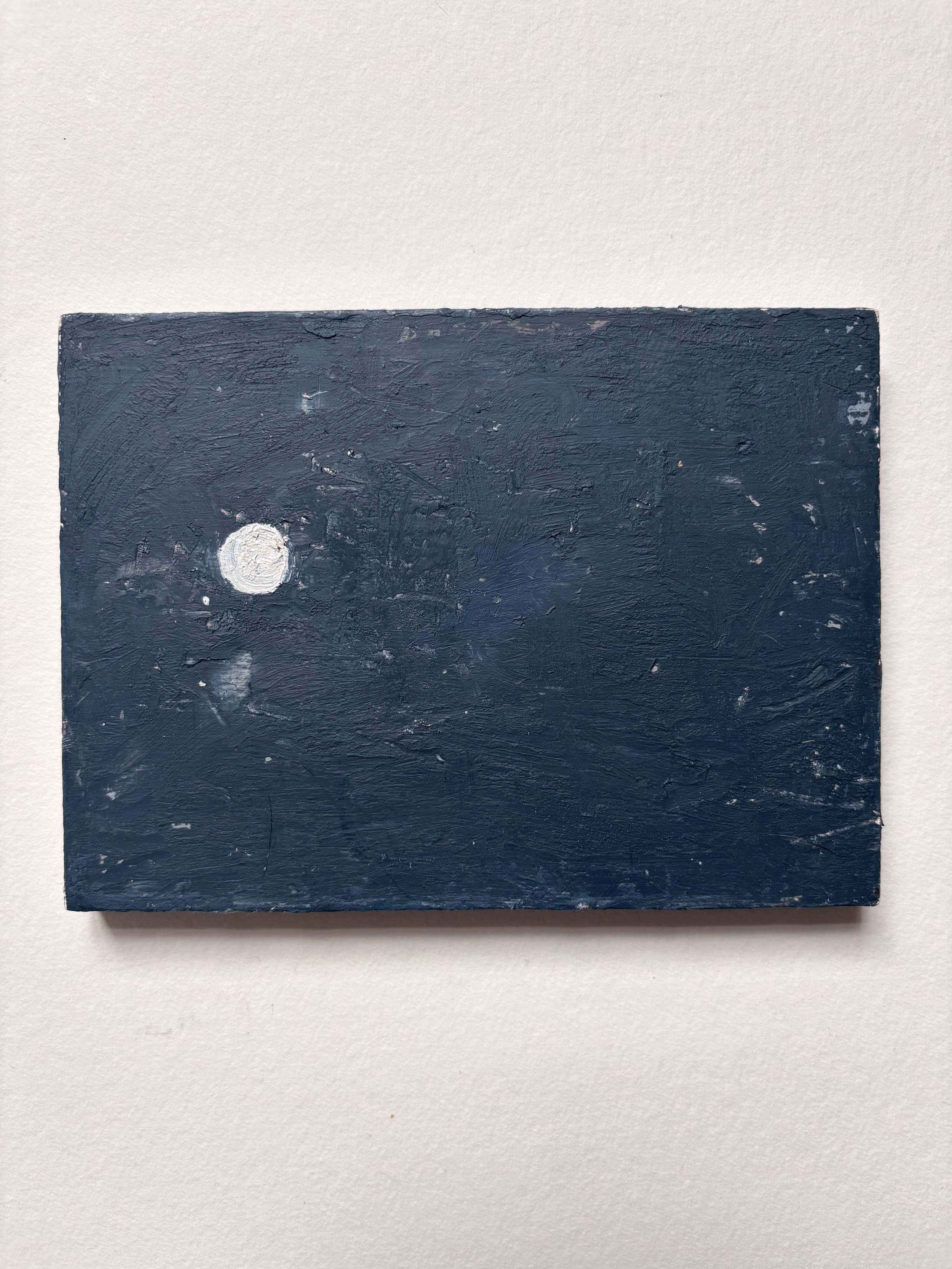 Working primarily in oil, she creates textured, contemplative surfaces that sit between abstraction and landscape. Her restrained palette of muted blues, greys, and earthy browns reflects a sensitivity to tone, texture, and light. Her process is slow and meditative, involving repeated layering, scraping back, and reworking until balance emerges.