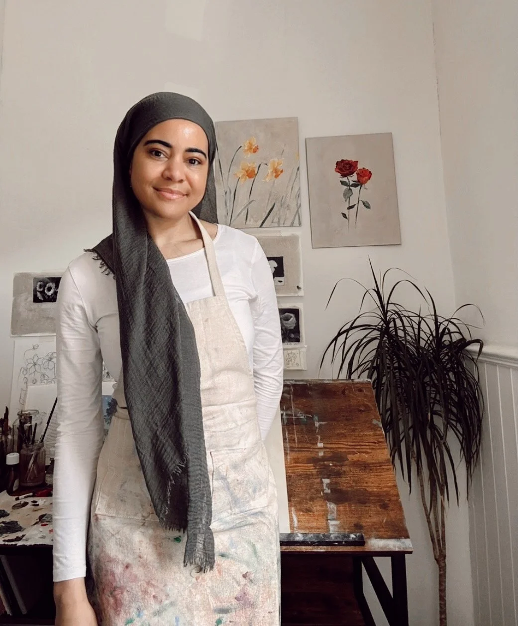 Helina Bassey (b. 1988) is a British artist, born in London and raised in West Yorkshire, England with Nigerian and White British heritage. Her love for drawing and painting began early and evolved alongside a deep connection to nature, identity, and spirituality. After studying art in Leeds, she worked across the charity and creative sectors with organisations including Arts Council England and Yorkshire Contemporary.